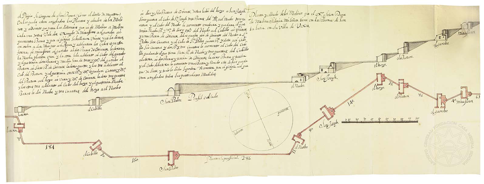 Título de la unidad: Planta y alzado de los molinos que el duque de Medina Sidonia tenía en la rivera de Santa Lucía, en Vejer de la Frontera.
