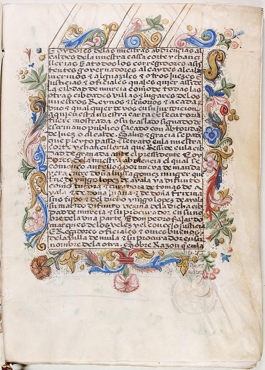 Resumen Título de la unidad: Ejecutoria ganada por Pedro Fajardo, marqués de los Vélez, a la mujer de Iñigo López de Ayala, sobre la pertenencia de la jurisdicción civil y criminal del lugar de Campos, situado en el término de Mula. Fondo: Vélez. Signatura: AGFCMS, leg. 795, doc. 08. |