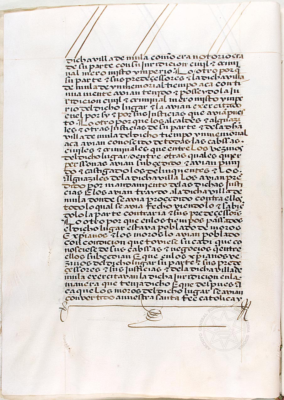 Resumen Título de la unidad: Ejecutoria ganada por Pedro Fajardo, marqués de los Vélez, a la mujer de Iñigo López de Ayala, sobre la pertenencia de la jurisdicción civil y criminal del lugar de Campos, situado en el término de Mula. Fondo: Vélez. Signatura: AGFCMS, leg. 795, doc. 08. |